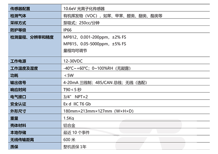 MP815是一款可以在極端惡劣環境中工作的固定式光離子檢測儀,專利技術傳感器設計以及溫度控制單元可以確保不受冷凝水影響,提高在惡劣環境中檢測可靠性;高穩定性以及長壽命光源可以大大減少客戶維護量以及使用成本;藍牙遙控以及手機App兩種操作模式,無需開蓋,輕松提高現場維護效率;OLED顯示屏即使在強光下依然清晰可見,極大提高了對現場危險因素響應速度;包括現場無線傳輸在內的多種數據傳輸方式,可被廣泛的應用在石油、石化、化工、制造加工行業、VOC有組織以及無組織排放檢測、半導體車間VOC控制等行業。